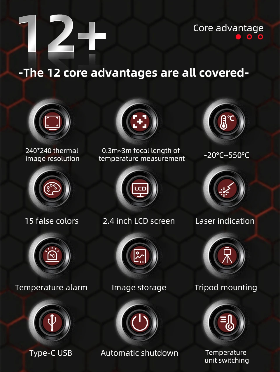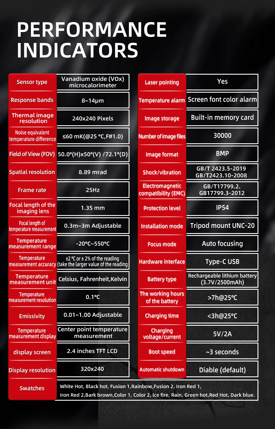2.4-inch screen, 15 false color modes, high and low temperature alarms for high accuracy Adjustable emissivity Data storage and export Temperature analysis of stored pictures is possible.