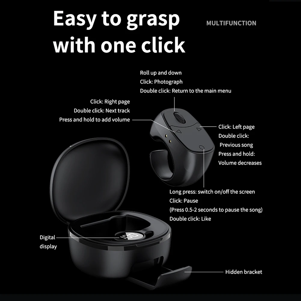 ![]() Fingertip Remote Control Bluetooth-Compatible 5.3 Scrolling Ring Multi-Function Selfie Button Digital Display for Outdoor Travel Features: