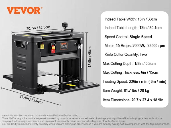 【High-quality 13" Widened Worktable】: Plane boards up to 6" thick and 13" wide. Easily adjusted tables and extensions for coplanar with table pull-out extensions, supplying 35" of total length for better support on the long stock. Precision machined cast iron bed and steel plate assist in keeping boards flat. Get your boards cut the way you want in no time.